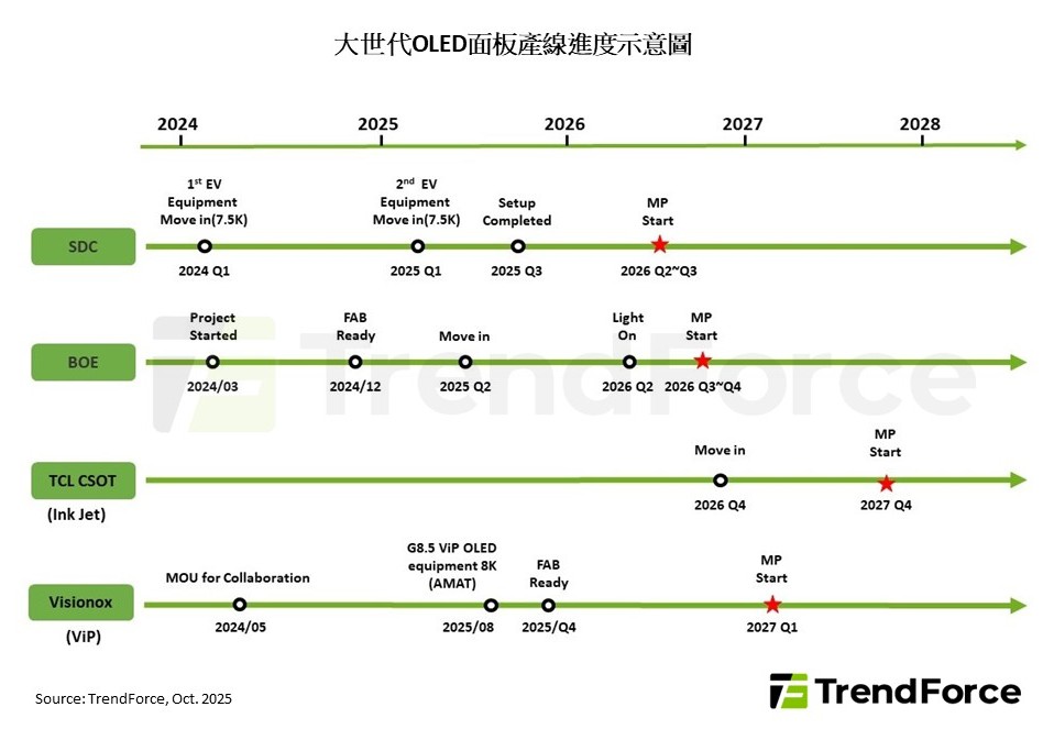 TCL CSOT則是採用噴墨印刷(IJP)技術,製程相較傳統FMM更加簡化,理論上能減少約30%材料損耗。近期8.6代OLED產線動土儀式落幕後,目標放量時間落在2027年第四季。