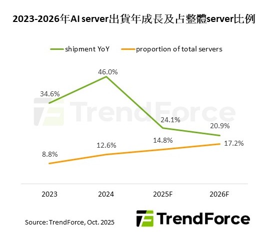 根據TrendForce最新AI server產業分析,2026年因來自雲端服務業者(CSP)、主權雲的需求持續穩健,對GPU、ASIC拉貨動能將有所提升,加上AI推理應用蓬勃發展,預計全球AI server出貨量將年增20%以上,占整體server比重上升至17%。