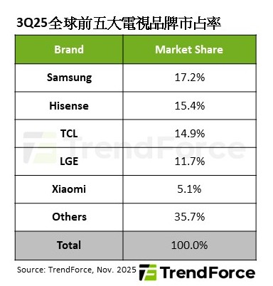 觀察第三季品牌出貨表現,前五大業者依序為Samsung、Hisense、TCL、LGE與Xiaomi,合計市占率達64.3%。其中Hisense下半年起由守轉攻,內外銷皆以低價搶市,成功推升第三季出貨量達766萬台、季增9.7%,重回全球第二,市占率也提升至15.4%,創歷年同期新高。