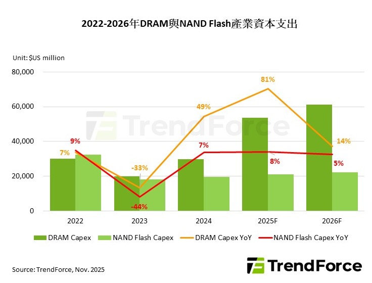 根據TrendForce調查顯示,隨著記憶體平均銷售價格(ASP)持續提升,供應商獲利也有所增加之下,DRAM與NAND Flash後續的資本支出將會持續上漲,但對於2026年的位元產出成長的挹注有限。DRAM和NAND Flash產業的投資重心正逐漸轉變,從單純地擴充產能,轉向製程技術升級、高層數堆疊、混合鍵合以及HBM等高附加價值產品。
