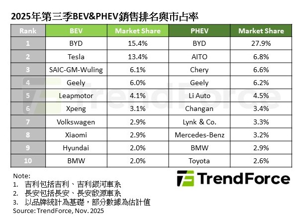 BYD(品牌)蟬聯第三季BEV銷量冠軍,但銷量較第二季減少。位居第二的Tesla第三季表現強勁,季增達29%,增長動能主要來自美國市場補貼期限的刺激,以及在中國市場實現季度成長。Geely和Leapmotor第三季展現驚人成長力道,市占率分別為6%、4.1%,並連續兩季超越Xpeng。