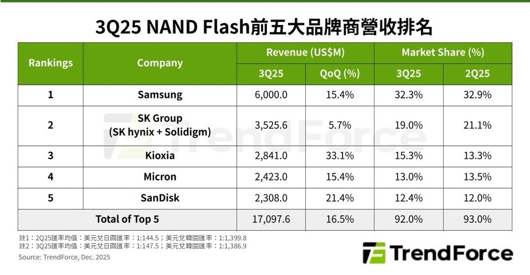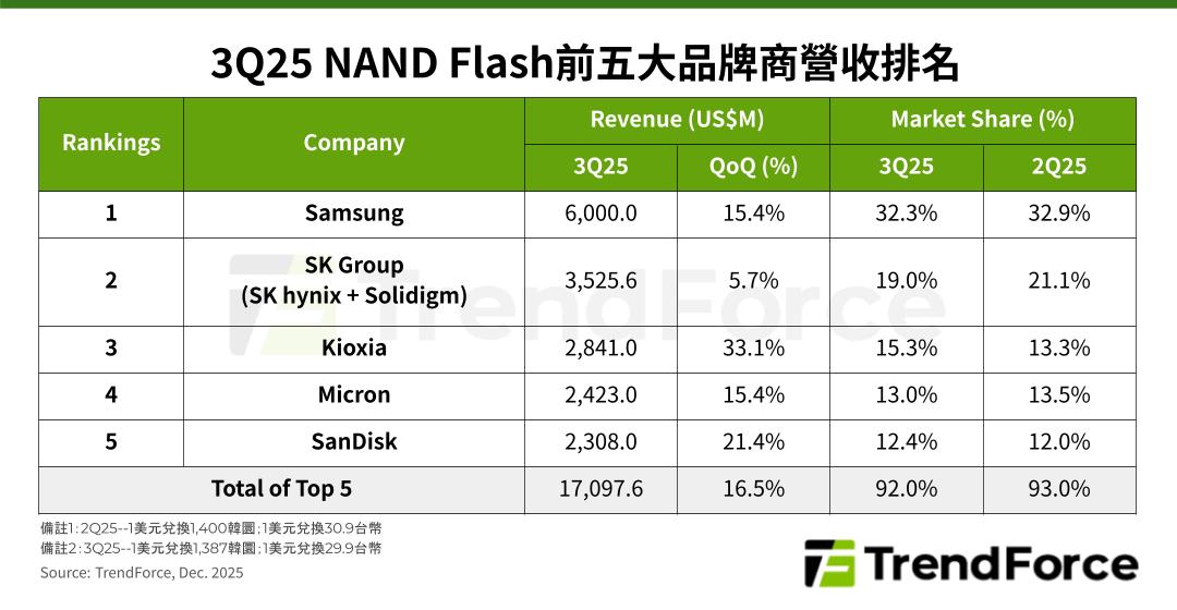 根據TrendForce最新調查,2025年第三季因雲端服務業者(CSP)持續擴建AI基礎建設,對enterprise SSD需求強勁,帶動前五大NAND Flash品牌商合計營收季增16.5%,逼近171億美元。上半年的減產措施奏效,下半年供需失衡情況獲得改善,加上enterprise SSD銷售占比提高,各原廠的平均銷售單價(ASP)皆有上漲。