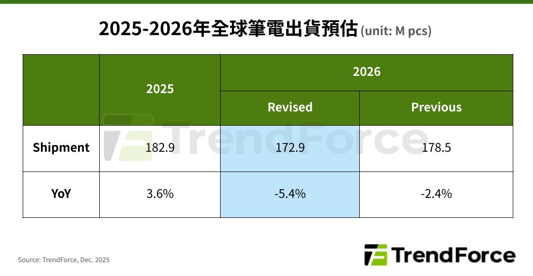 根據TrendForce最新調查,在整體經濟復甦力道有限、消費行為趨於保守的背景下,快速上升的記憶體價格正快速侵蝕筆電品牌的獲利及定價彈性。因此,TrendForce再度下調2026年全球筆電出貨預估至年減5.4%,降至近1.73億台,以反映品牌面對成本壓力擴大,對庫存、促銷與產品配置採取的保守態度。