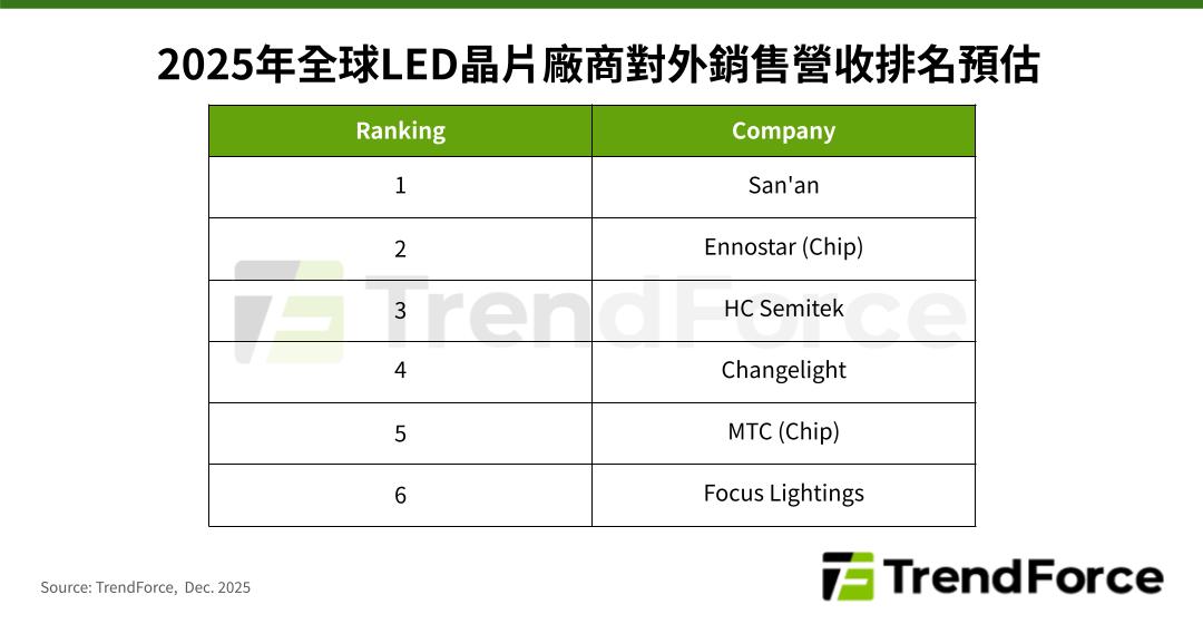 TrendForce預估,2025年全球LED晶片對外銷售市場總產值為28.41億美元,兆元光電排名第九,LED晶片業務營收主要來自照明、背光和Mini LED顯示屏應用。