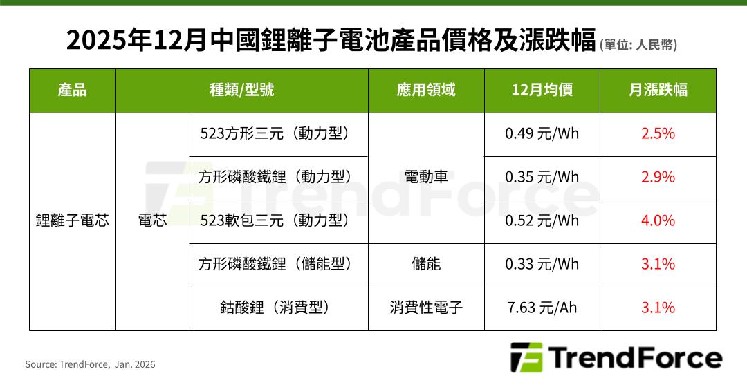 根據TrendForce最新鋰電池價格研究報告披露,2025年12月電池級碳酸鋰均價大幅月增17%,達每公噸人民幣10.3萬元,加上銅、鋁、鈷和電解液等原料價同步提高,推升方形鐵鋰、方形三元和軟包型三元動力電芯價格分別較11月上漲2-4%。