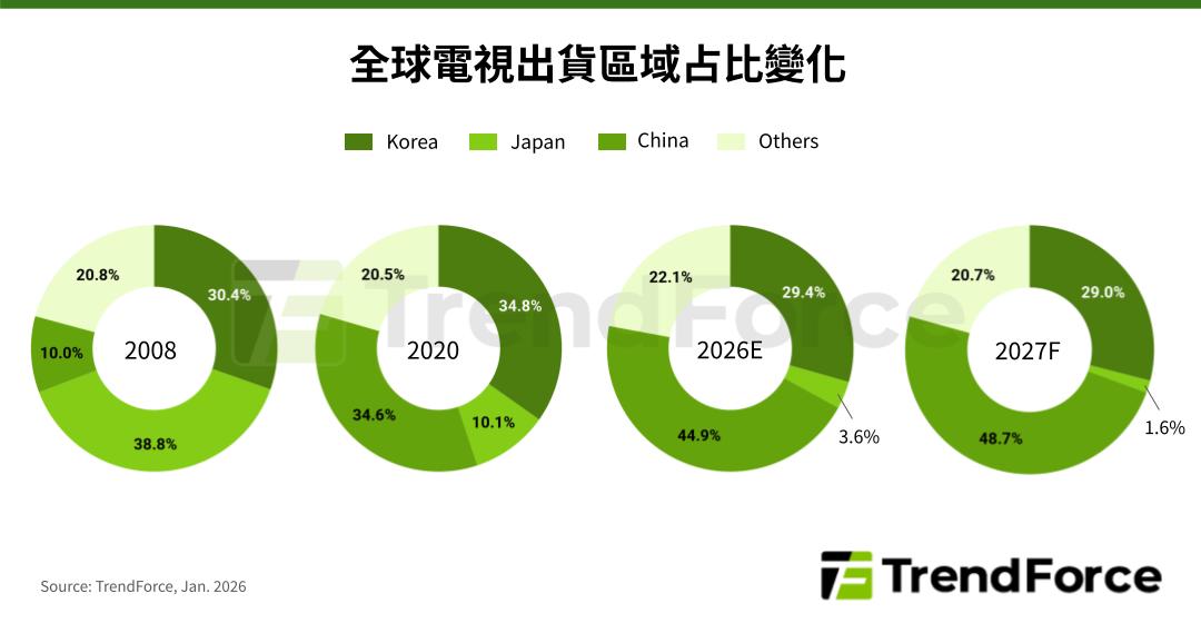 回顧過去,日系品牌曾掌握近40%全球電視市占率,但在中國品牌快速崛起與價格競爭下,Toshiba、Funai、Panasonic先後轉為授權或出售電視事業。隨著 TCL與 Sony合資公司待監管單位核准後、預計於2027年4月正式啟動,中國品牌在全球電視市場的整體市占率,預期將進一步向五成推進,市場主導權轉移趨勢將更加明確。