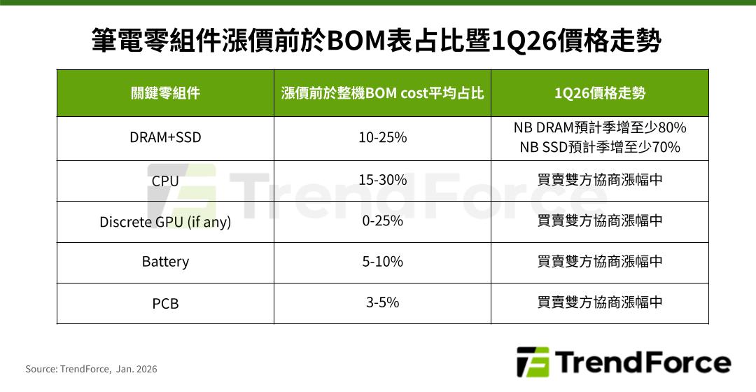 根據TrendForce最新筆電產業調查,全球筆電品牌自2025年下半年起面臨記憶體價格顯著上漲的壓力,2026年初開始,又遭遇CPU階段性供給缺口、價格調漲的挑戰,加乘PCB、電池、電源管理IC等零組件成本同步上行,預估將導致2026年第一季全球筆電出貨季減14.8%,恐難符合品牌原先預期。