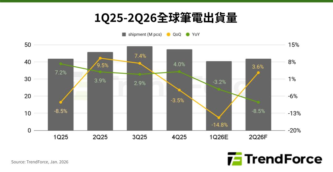 即便供給風險擴大,品牌端對2026年第一季的出貨預估仍持積極態度,然而,TrendForce考量品牌可能無法在預定時間點備齊所有物料,預估第一季全球筆電出貨量將季減14.8%,第二季則有望因Intel CPU到貨率好轉,呈溫和季增。