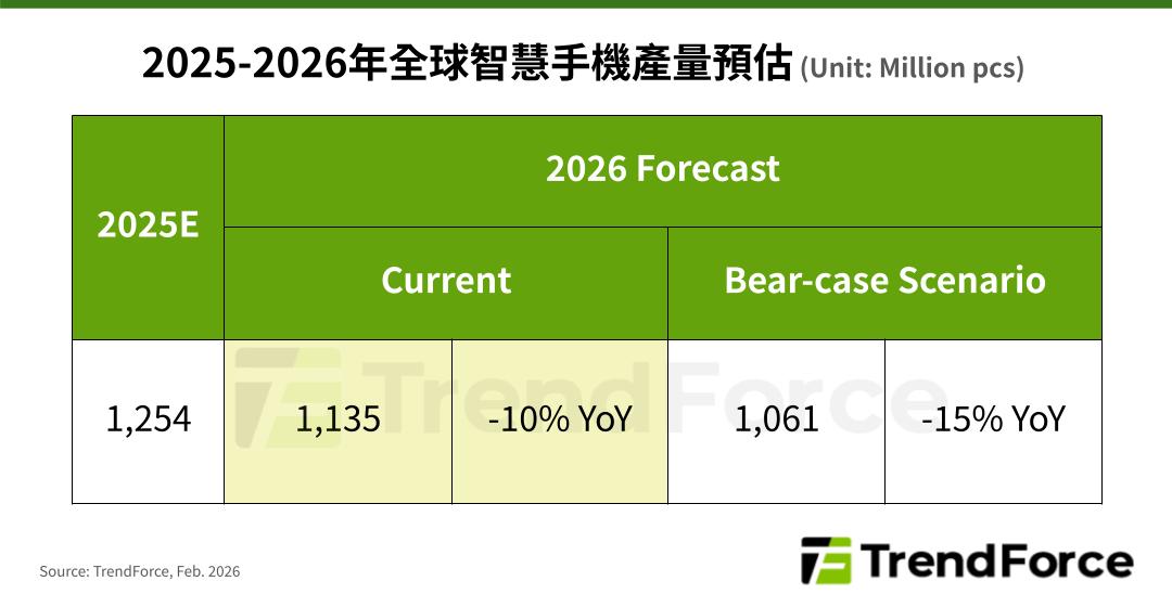 根據TrendForce最新智慧手機研究,2026年全球手機生產表現受記憶體價格高漲影響,恐呈現10%的年衰退,總量約降至11.35億支。然而,記憶體漲勢未歇,加劇終端售價與消費者期望之間的差距,恐導致終端需求更加疲弱。因此,TrendForce進一步預測在悲觀情境(bear-case scenario)下,今年全球手機生產年減幅度將擴大至15%或更甚;而各品牌因產品結構、區域布局不同,受衝擊程度也將各異。