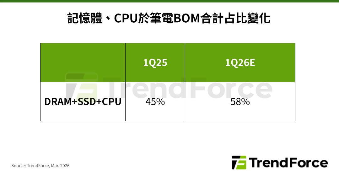 由於CPU原本即是筆電BOM占比最高的核心零組件之一,價格上漲將進一步推升整機成本。以900美元的機種來看,若記憶體、CPU價格同時提高,預估兩者在BOM的合計占比將從45%上升至58%左右。假設品牌廠、通路端仍維持原有毛利率,成本壓力可能傳導至終端售價,造成近40%的價格漲幅。