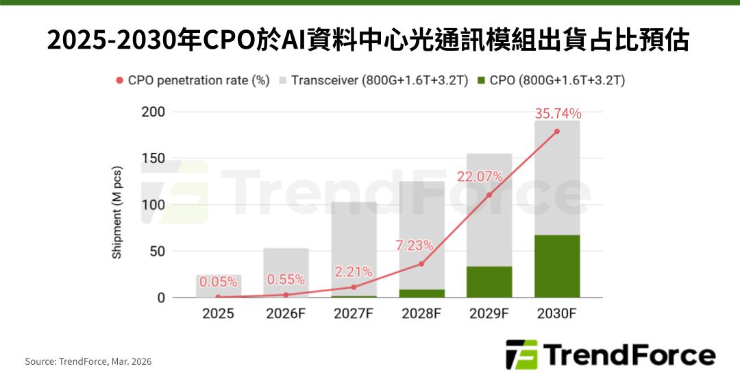 根據TrendForce最新高速互連市場研究,NVIDIA下世代的AI算力櫃架構顯示,未來GPU設計重心將轉向更高密度的晶片互連,和更高速的資料傳輸,機櫃內晶片互連(Scale-Up)及跨機櫃的大規模互連(Scale-Out)將成規劃資料中心的核心課題。使用銅纜的傳統電氣傳輸方案,受物理限制無法應對超大規模的資料搬運需求,光學傳輸方案因此獲得發展空間。TrendForce預估,CPO(共同封裝光學)在AI資料中心光通訊模組的滲透率將逐年成長,有機會於2030年達35%。