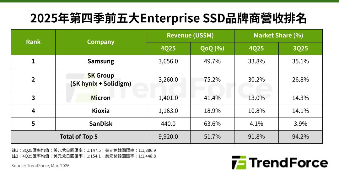 營收第二名為SK Group(含SK hynix和Solidigm),旗下Solidigm長期布局高容量QLC產品,於2025年第四季迎來收成期,推升集團整體營收至32.6億美元,季增超過75%,成長幅度領先同業,市占率也上升至30.2%。SK Group針對生成式AI從training走向inference的趨勢,制定清晰產品路線,以技術化差異鞏固在enterprise SSD的市占率。