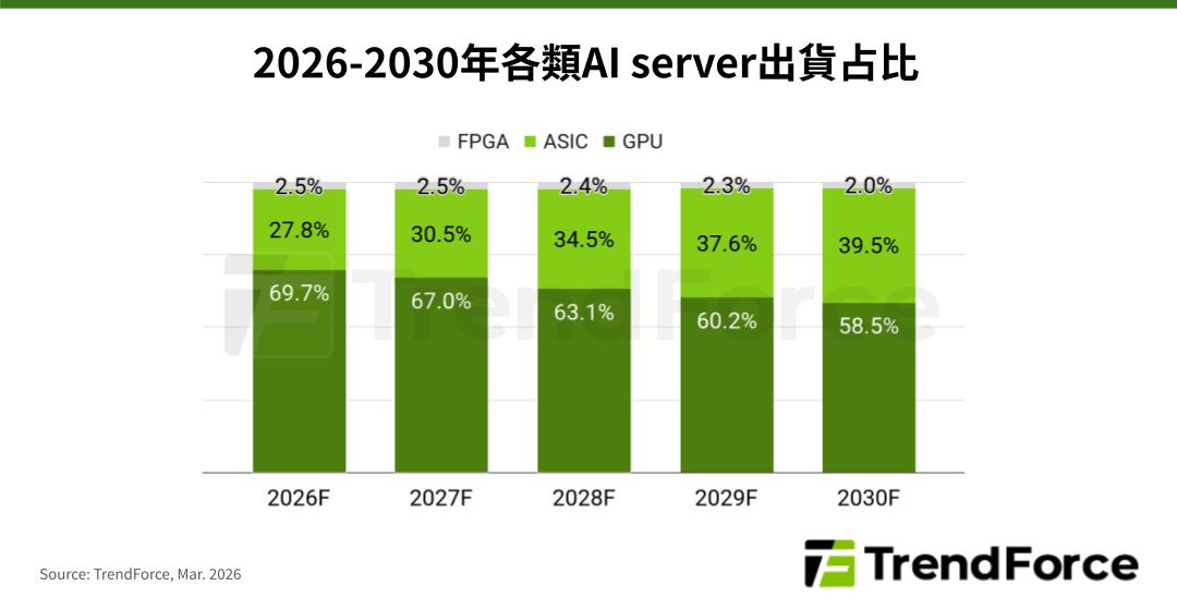 TrendForce表示,隨著以Google、Amazon等CSP為首的自研晶片態勢擴大,預估ASIC AI server占整體AI server的出貨比例將從2026年的27.8%,上升至2030年的近40%。