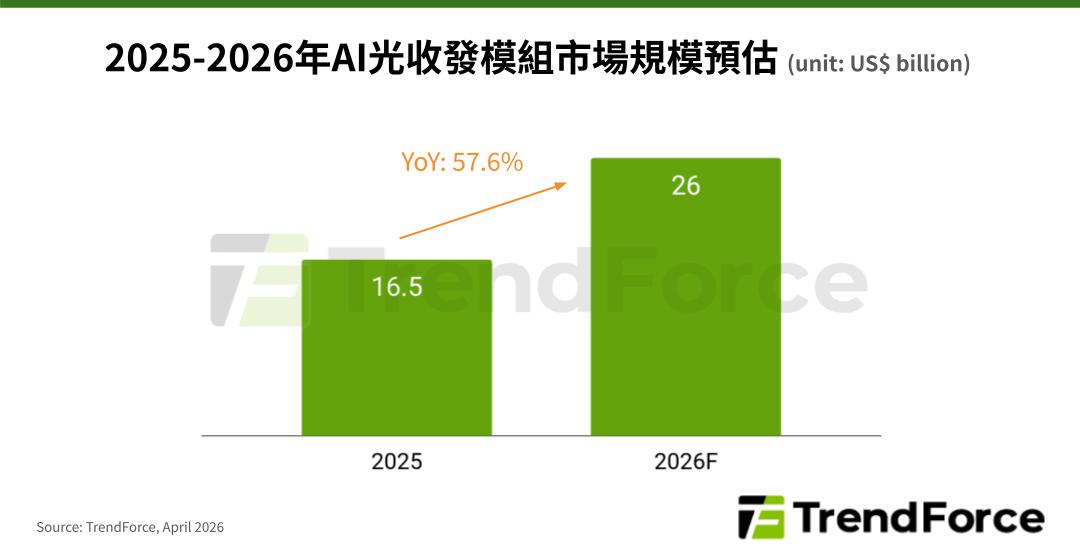 根據TrendForce最新研究,全球AI專用光收發模組市場進入高速成長階段,預估市場規模將從2025年165億美元,一舉擴大至2026年260億美元,年增超過57%。強勁成長不僅來自規格升級,更反映AI資料中心加速建置下,整體光通訊供應鏈正面臨結構性重組。