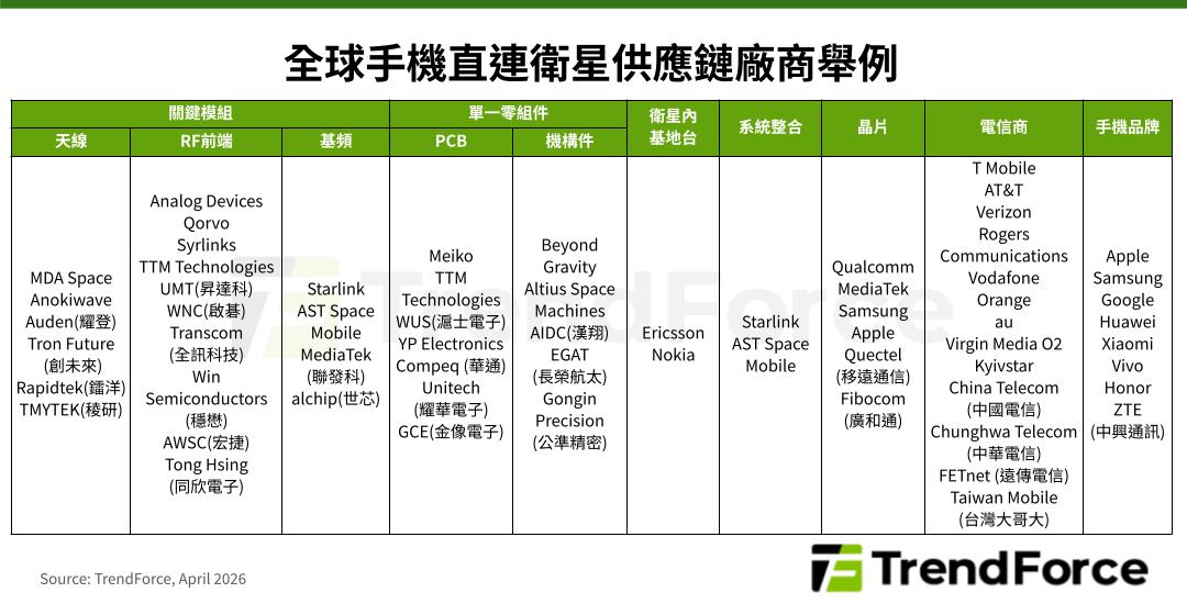 分析全球手機直連衛星供應鏈,上游聚焦關鍵模組,涵蓋天線、射頻前端與基頻晶片。例如Anokiwave提供衛星晶片,Analog Devices、Qorvo供應射頻模組;而Starlink、AST SpaceMobile則自行開發基頻模組,以克服太空通訊的高延遲問題。供應鏈中游為衛星內基地台與系統整合,通常由零組件廠提供模組後,交由Starlink、AST SpaceMobile進行整體的衛星系統整合。下游為手機與電信服務端,由Samsung、Google、Vivo等品牌導入Qualcomm或MediaTek的衛星通訊晶片,並由電信商推出對應的手機直連衛星服務方案。